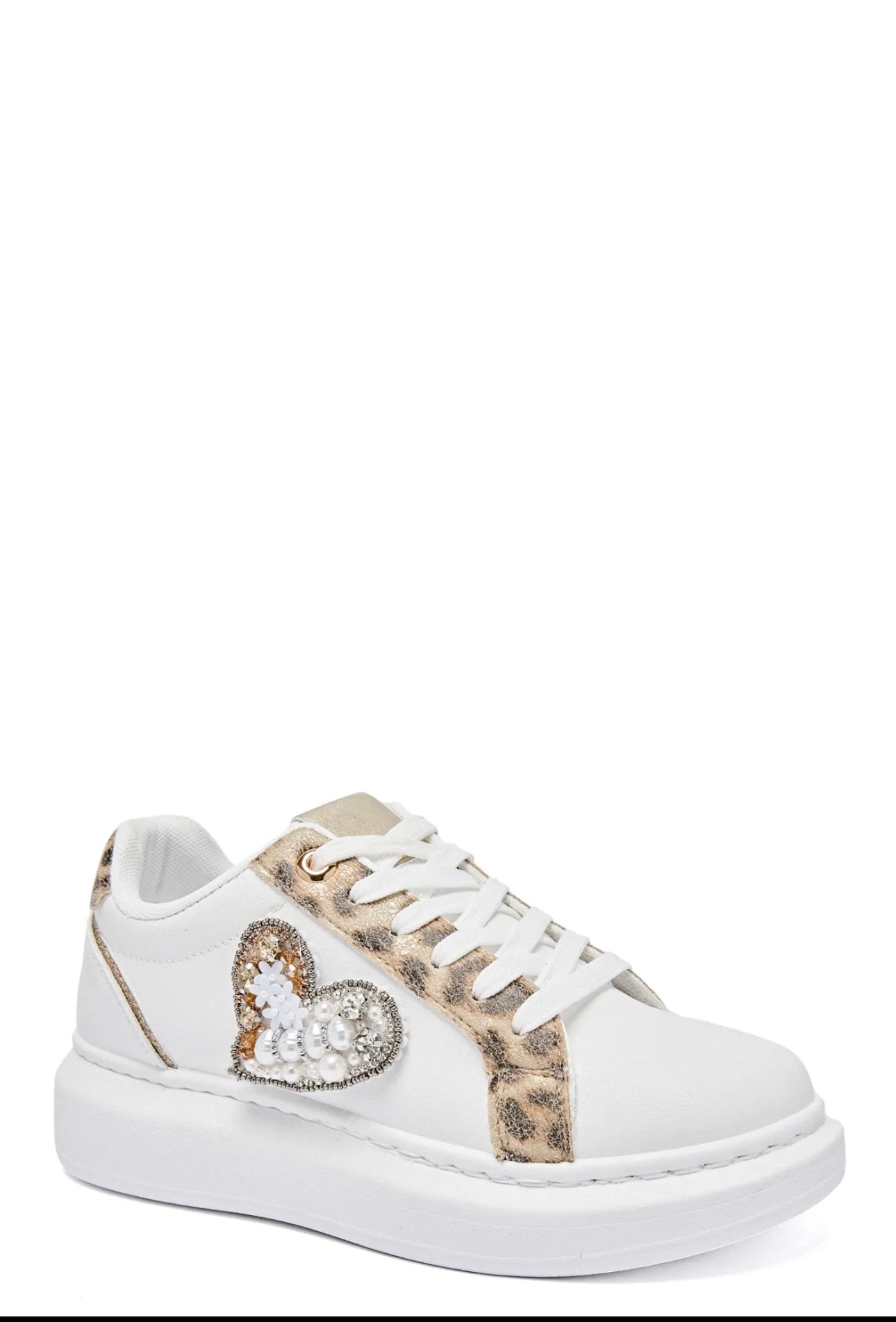 Step up your casual look with these stylish white trainers featuring a removable embellished heart patch. Designed with leopard-print metallic accents and a chunky white sole, they combine comfort with eye-catching detail. The heart patch is adorned with pearls, sequins, and beads, adding a playful and glamorous touch that you can remove for a more minimal look.