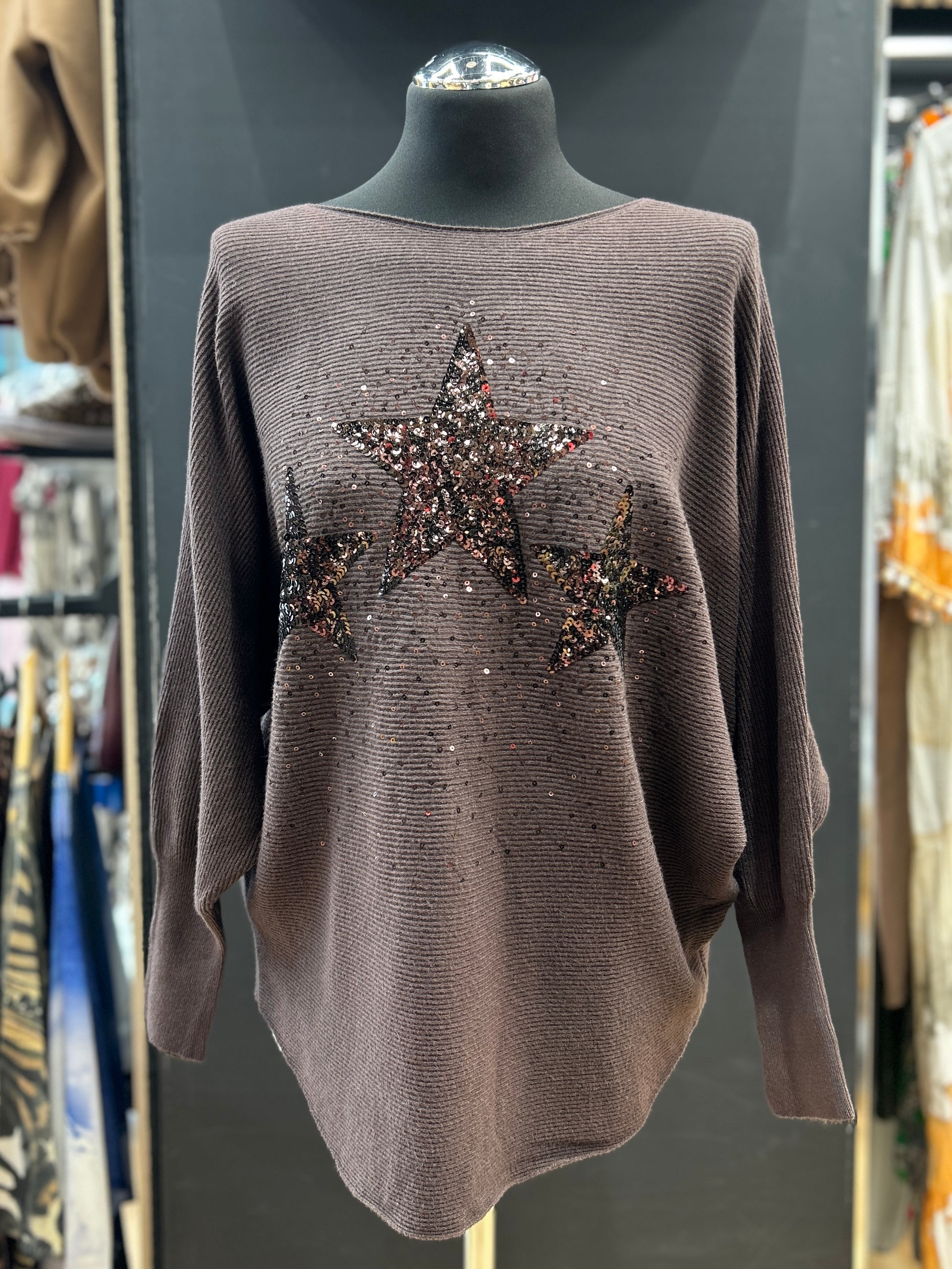 Shine bright with this relaxed knit sweater featuring three dazzling sequin star motifs across the front. Designed with a loose, comfortable fit and soft ribbed texture, it effortlessly blends cozy style with a touch of sparkle. Perfect for elevating everyday looks or adding a festive twist to your wardrobe, this sweater pairs easily with jeans, leggings, or skirts for versatile wear