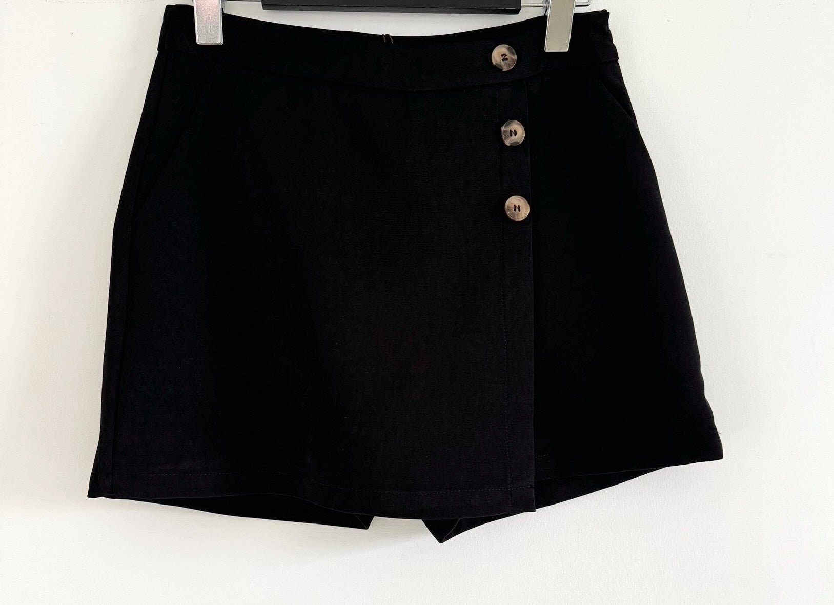 A pair of skorts (a combination of shorts and a skirt), designed with a front flap that resembles a skirt and three decorative buttons on the right side. The fabric appears smooth and structured, likely a polyester or cotton-blend, ideal for casual or semi-formal wear.