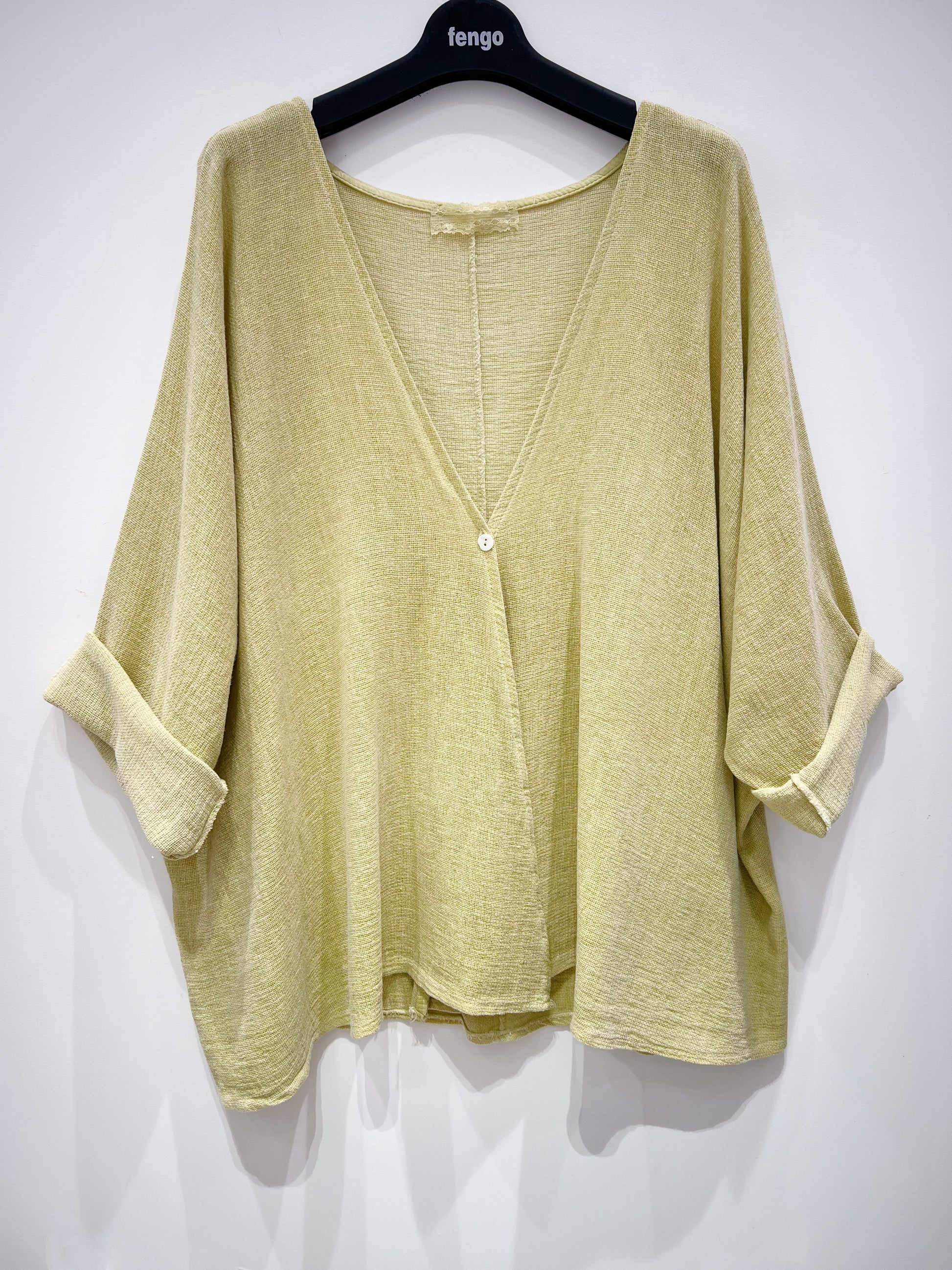 Breezy, beautiful, and effortlessly chic — the Driftwood Drape Top is a wardrobe essential for lovers of laid-back style. Made from a breathable blend of 50% linen and 50% cotton, this one-size-fits-most piece (UK 8–16) features a soft, textured weave with a graceful draped V-neck, a single front button, and rolled sleeves for a casual, beachy feel.